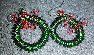 In the end I sold about 12 pairs of earrings including both pairs of wreaths (and I’m not making any more of them), the pearl snow woman, most of the jingle bells, two eco-chic designs including the orange curling ribbon, and one design I adored which I think was called 3 peas in a pod.