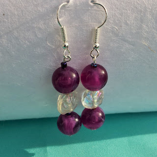 The purple beads feature a marble type effects, traces of white swirling around them. In the center there is a iridescent glass bead with a swirl effect on it. Those three beads are separated by small purple iridescent beads. The findings are silver plated, and can be replaced by kidney wires or clip on if you’d prefer. They hang about an inch and a half from the ear.